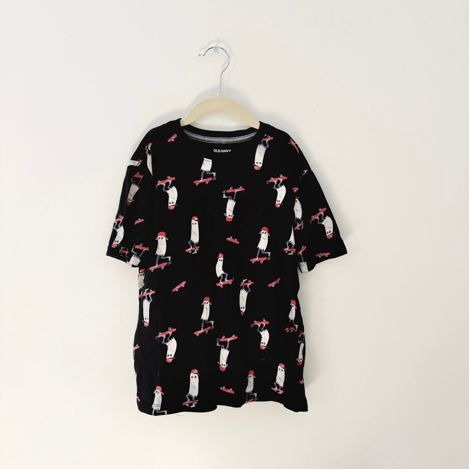 Super cute boy on skateboard in a ghost costume. Great condition. Size 10/12.