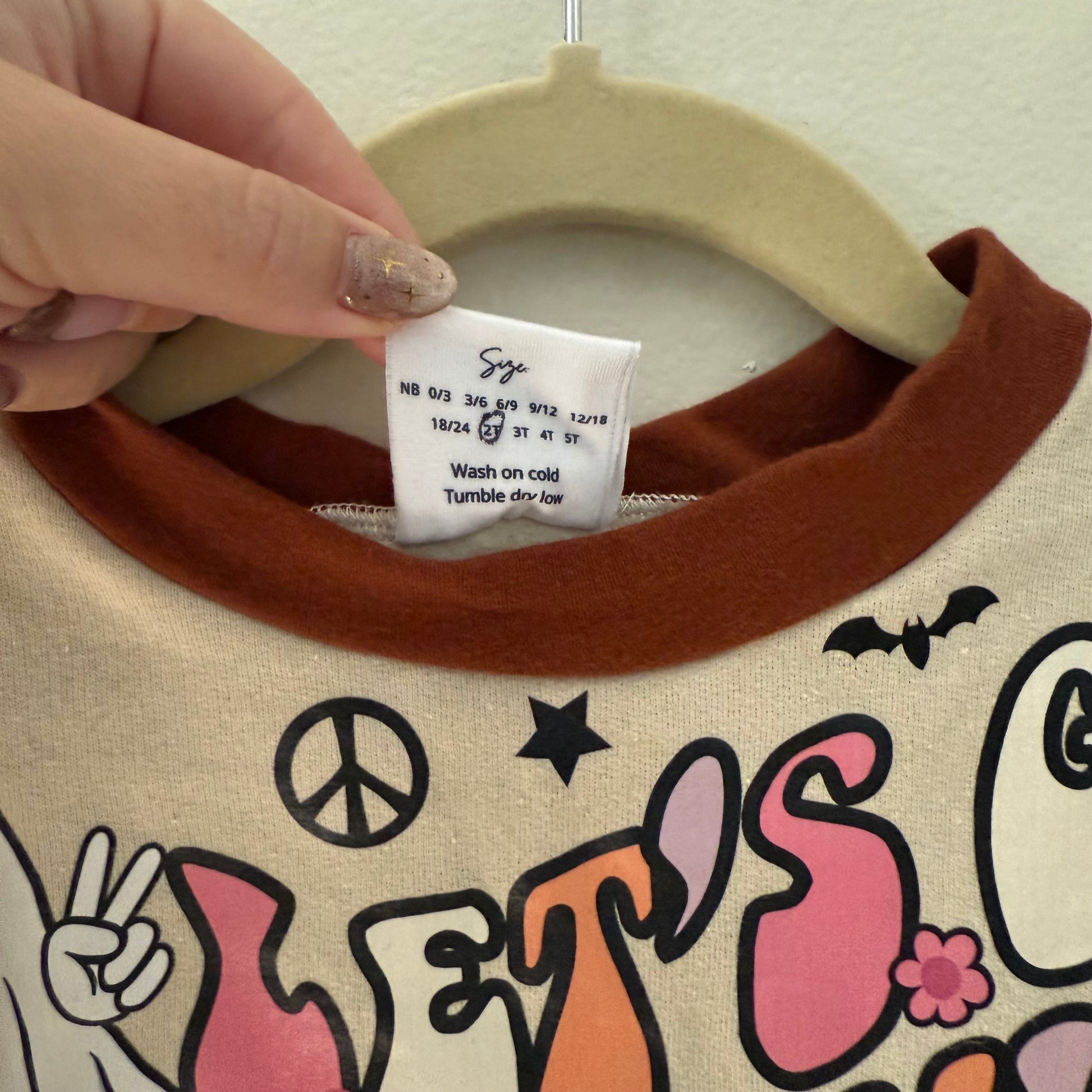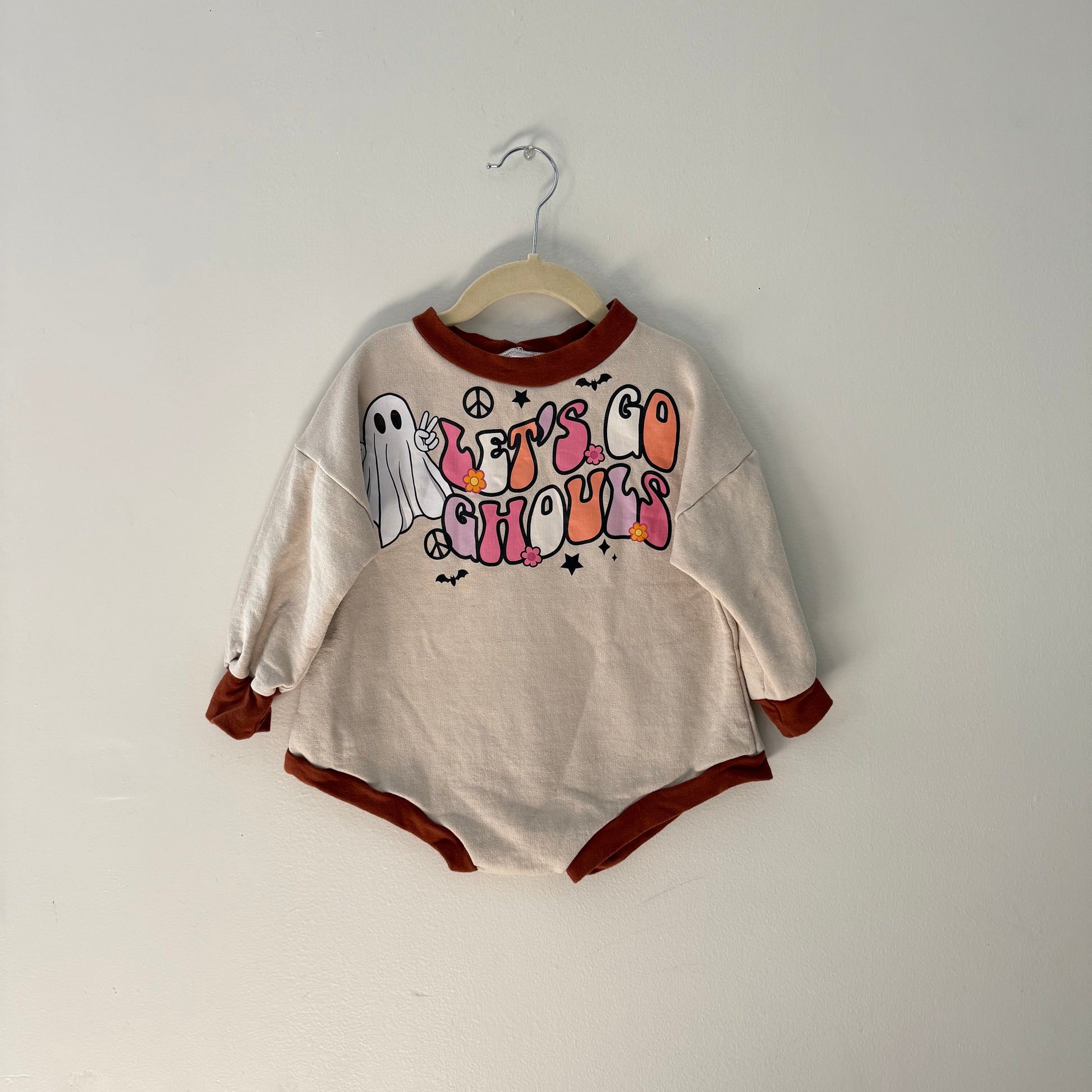 Toddler romper with a festive Halloween theme. It’s a long-sleeve cream-colored romper with burnt orange trim around the collar, cuffs, and leg openings. The front features a retro-style graphic with a ghost holding up a peace sign and the text “LET’S GO GHOULS” in bold, colorful, groovy letters decorated with flowers, stars, and small bats. Great worn condition. Size 2T.