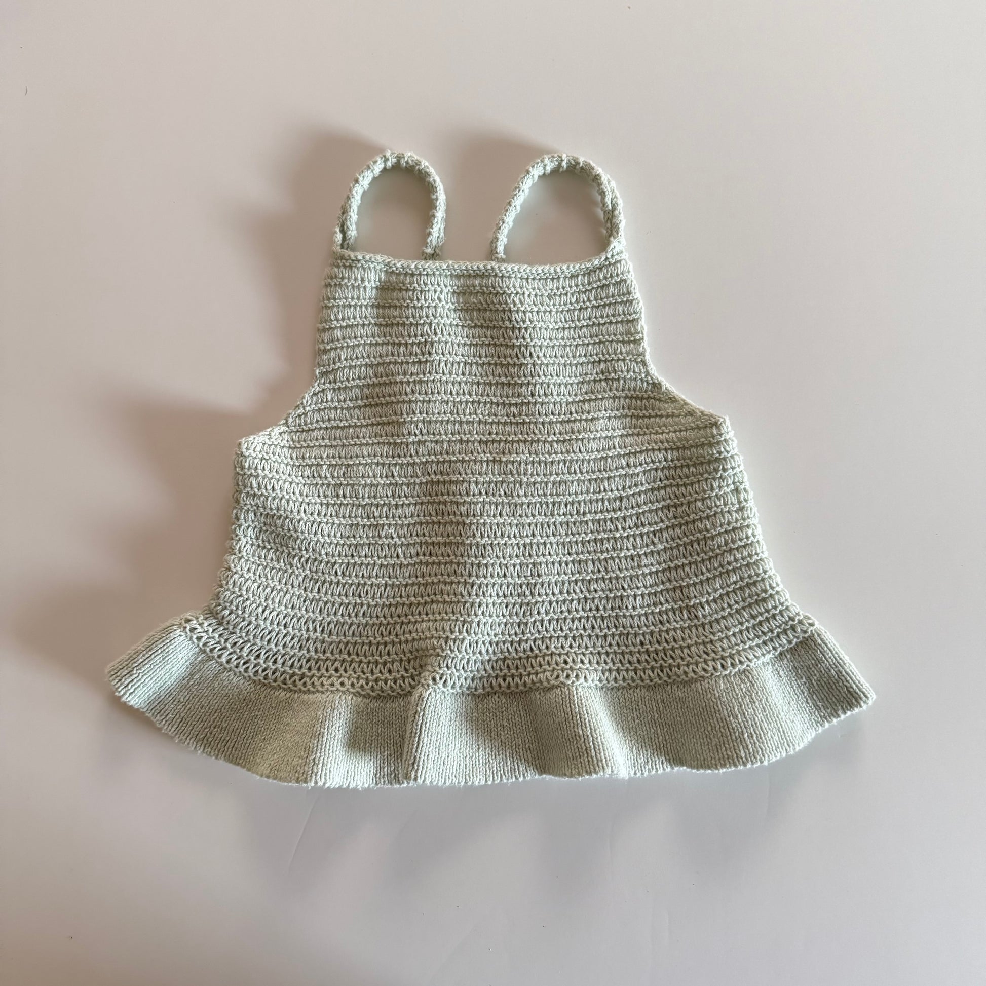 This piece is such a sweet and airy knitted baby top! It has a light, minty-green tone with a sleeveless, strappy design—perfect for warmer weather. The side with the buttons is the BACK. The side with no buttons is the FRONT. Great worn condition.